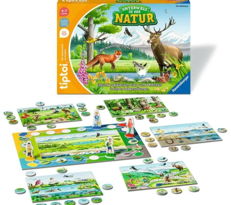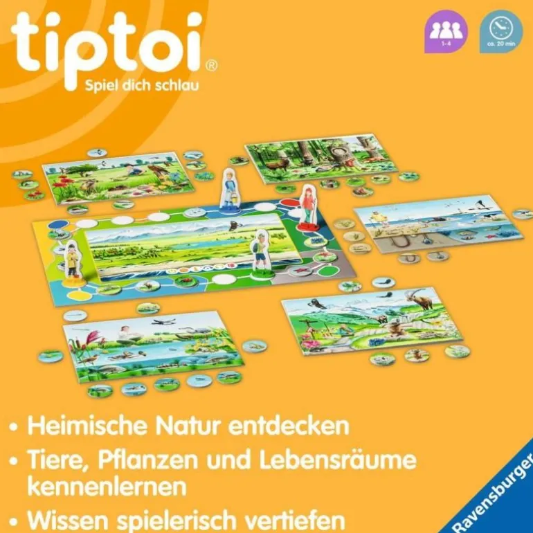 Die detailgetreuen Illustrationen auf den Landschaftstafeln laden zum Entdecken ein. Der Stift vermittelt Wissen zu den heimischen Landschaften und zu den wichtigsten Pflanzen und Tiere, die dort zu finden sind. Im Spiel können die Kinder ihr Wissen unter Beweis stellen. Dabei haben sie Spaß und Erfolgserlebnisse. Gleichzeitig erfahren sie, dass es wichtig ist, die Natur zu schützen. Tippen, spielen, lernen! tiptoi macht Bücher und Spiele lebendig. Tippen die Kinder mit dem Stift auf Bilder und Texte, erklingen Geräusche, Sprache und Musik. So macht Lernen richtig Spaß! Das tiptoi-Sortiment umfasst Bücher und Spiele mit den wichtigsten Lern- und Wissensthemen für Kinder ab 2 Jahren. Die zugehörigen Audiodateien lädt man einfach, sicher und schnell über den tiptoi Manager oder die optional erhältliche Ladestation auf den Stift.tiptoi-Stift nicht enthalten. Muss separat erworben werden.