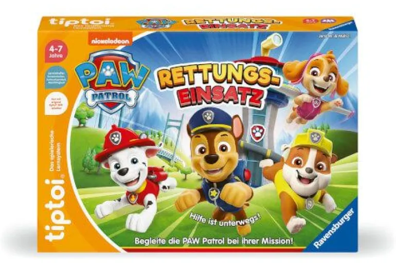 Hier ist die mutige PAW Patrol gefragt! Ob zu Wasser, in der Luft oder an Land – die Retter auf vier Pfoten erfüllen spannende Missionen. Für jeden Einsatz stellen die Kinder ein Hundeteam entsprechend der geforderten Fähigkeiten und Attribute zusammen. Muss ein Feuer gelöscht werden? Dann ist Marshall die beste Wahl. Wird eine Person vermisst? Spürnase Chase ist in dem Fall der perfekte Hund. Sobald das Team steht, führen die Kinder mit den Hunden die Rettungsmission durch.Tippen, spielen, lernen! tiptoi macht Bücher und Spiele lebendig. Tippen die Kinder mit dem Stift auf Bilder und Texte, erklingen Geräusche, Sprache und Musik. So macht Lernen richtig Spaß! Das tiptoi-Sortiment umfasst Bücher und Spiele mit den wichtigsten Lern- und Wissensthemen für Kinder ab 2 Jahren. Die zugehörigen Audiodateien lädt man einfach, sicher und schnell über den tiptoi Manager oder die optional erhältliche Ladestation auf den Stift.