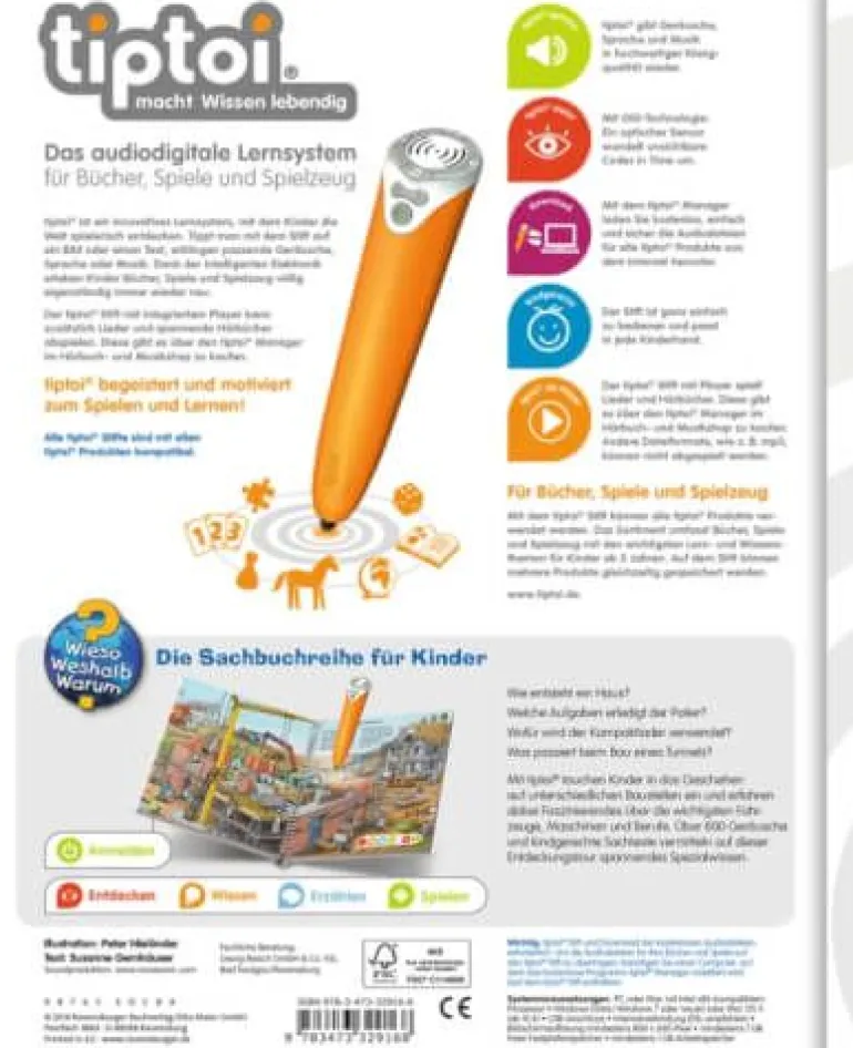 Was ist ein Rohbau? Was sind die Aufgaben eines Dachdeckers? Und wie funktioniert die Tunnelbohrmaschine? Auf verschiedenen Baustellen können Kinder Fahrzeuge, Maschinen und Werkzeuge aus nächster Nähe entdecken. Funktioniert nur mit tiptoi® Stift. Brumm, knatter, polter – hier sind die Kinder auf der Baustelle hautnah mit dabei. Detailreiche Illustrationen der Fahrzeuge und der Arbeit auf Baustellen. Große thematische Vielfalt rund um ein beliebtes Fahrzeug- und Technikthema.