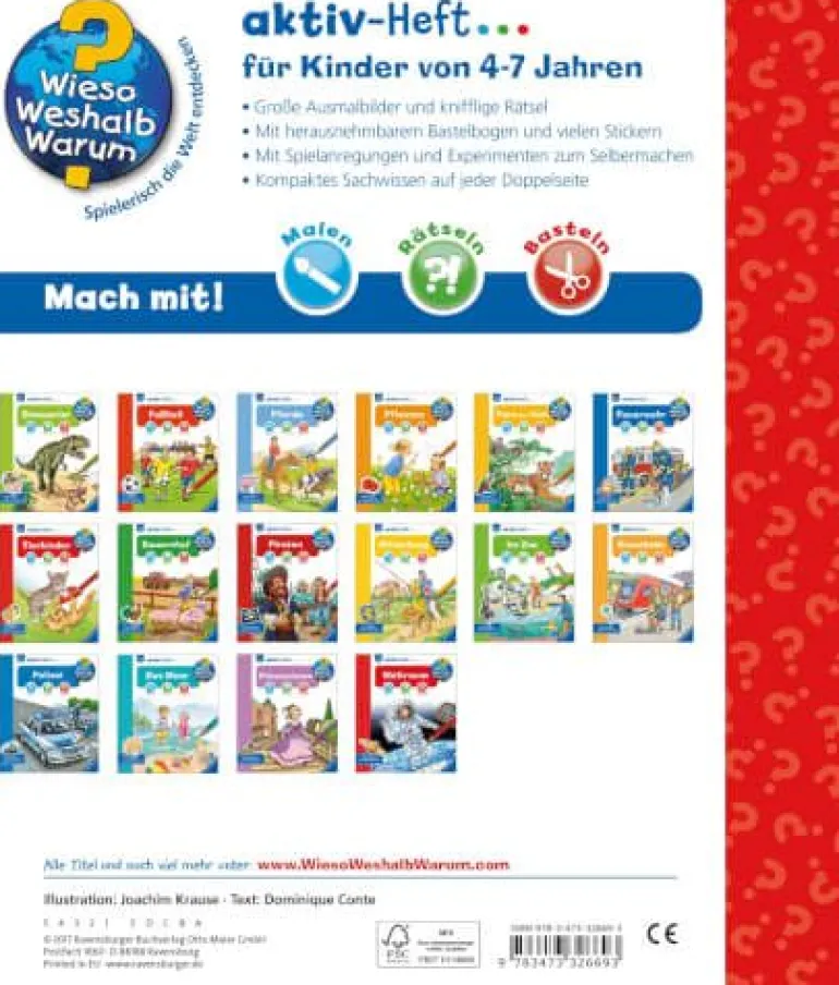 Was ist ein Stern? Warum verändert der Mond seine Gestalt? Wie sieht es in einer Raumstation aus? In diesem Heft starten Kinder in die Weiten des Weltalls. Sie malen Planeten aus, stickern Sternenbilder und basteln eine Rakete. Mit dabei in der Schwerelosigkeit: faszinierendes Sachwissen über das All, die Raumfahrt und Astronauten. Wieso? Weshalb? Warum? aktiv-Heft Malen, Rätseln und Basteln für Kinder von 4-7 Jahren Mit den Wieso Weshalb? Warum? aktiv-Heften erschließen Kinder sich ihre Lieblingsthemen selbstständig. Große Bilder laden zum Ausmalen ein. Kurze, kindergerechte Texte vermitteln Sachwissen, das durch abwechslungsreiche Rätsel auf spielerische Weise vertieft wird. Einfache Experimente und vielfältige Spielanregungen sorgen für viel Spaß. Darüber hinaus laden Bastelideen und Sticker Kinder dazu ein, selbst kreativ zu werden.