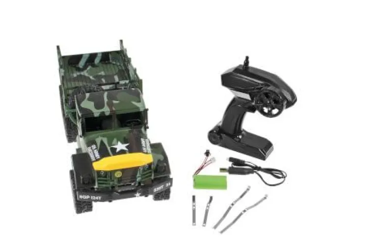 Der 6×6 Militär Truck im Maßstab 1:16 im Design der US Army wird jeden Offroad-Fan begeistern. Wie im Original werden bei dem hoch detaillierten Truck alle 6 Räder per Kardanwellen angetrieben. Durch vollständig gesperrte Differentiale entfaltet der Truck im Gelände sein Können. An dem Leiterrahmen aus Aluminium sind die voll funktionsfähigen Metall-Blattfedern befestigt und unterstützen den kraftvollen Elektromotor bei jeder Fahrt. Ausgestattet mit einer modernen 2.4 GHz 2- Kanal Fernsteuerung kann der Truck präzise und störungsfrei gesteuert werden. Die genauen Proportionen und die hochwertige Verarbeitung werden alle Fahrer begeistern. Als Stromversorgung wird ein austauschbarer 7,4V Li- Ion Akku mitgeliefert, der mit dem enthaltenen USB-Ladegerät geladen werden kann. Außerdem kann auch das Ersatzrad wie im Original gewechselt und genutzt werden.