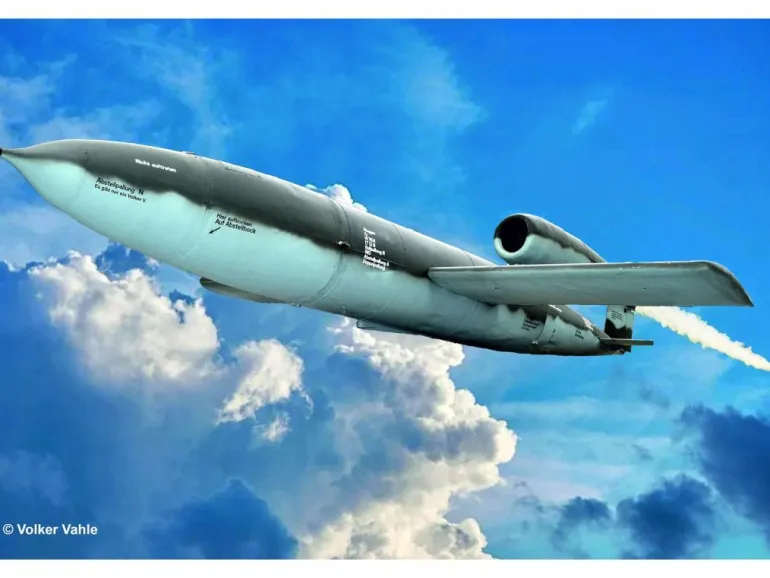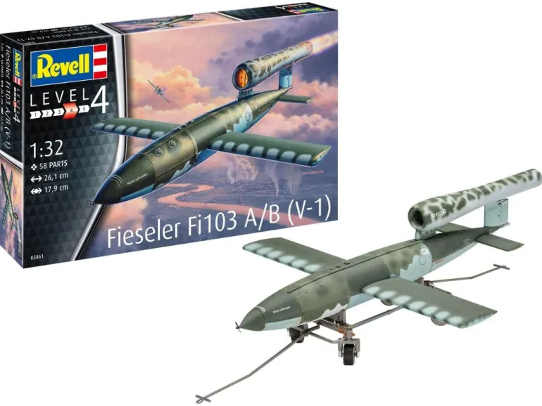 Modellnachbildung der Fieseler Fi103, auch bekannter als Vergeltungswaffe 1. Sie kam ab Mitte 1944 in größerer Stückzahl zum Einsatz, u. a. gegen London. – Authentische Oberflächendetails des Flugkörpers – Detaillierter Lufteinlaufbereich – Transportwagen mit beweglichen Rädern Authentische Darstellung folgender Versionen: – Fieseler F-103A V-1, WkNr. 256839, Tramm/Dannenberg 1945 – Fieseler F-103A V-1, WkNr. 708153, Tramm/Dannenberg 1945 – Fieseler F-103B V-1, Flakregiment 155/W, France, Summer 1944