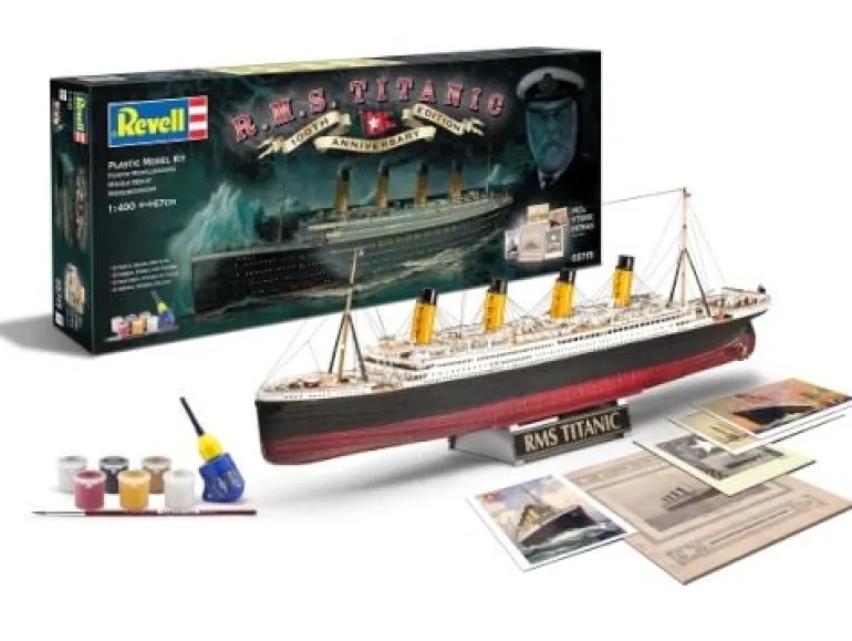 Dieses Geschenkset erscheint in einer informativen Sonderverpackung anlässlich „100 Jahre Titanic“. Neben dem Plastikmodellbausatz im Maßstab 1:400, beinhaltet dieses exklusive Set 6 Basisfarben, einen Pinsel sowie Kleber. Als besondere Beilage liegen Originalnachdrucke historischer Dokumente bei. Dies sind: 3 Postkarten, eine Speisekarte der ersten Klasse, eine 28-seitige Werbebroschüre der White Star Line. – Detaillierter Rumpf mit strukturierter Beplankung – Drei Schiffsschrauben – Separates Ruder – Detaillierte Decks mit Holzplanken-Struktur – Detaillierte Decksaufbauten – Rettungsboote und Davits – Separate Reeling – Lastkräne – Detaillierte Schornsteine – Treppenaufgänge – Detaillierte Masten – Displayständer – Detaillierte Abziehbilder mit Dekorstreifen Neben Basisfarben sind auch Kleber und Pinsel enthalten.