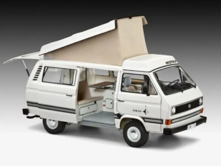 Der sparsame, zuverlässige Kleintransporter T3 wurde ab 1979 hergestellt. Der völlig neu entwickelte Wagen mit seiner modernen, zweckmäßigen Formgebung war sichtlich geräumiger als sein Vorgänger. Als letzter von VW hergestellter Typ mit einem Heckmotor wurde er als der letzte echte Bulli angesehen. Je nach Ausführung bot sein Vierzylinder 50 bis 112 PS Leistung. Wie üblich erschien der Transporter in verschiedenen Nutzfahrzeug-Versionen, aber auch in Form des Campingbusses für private Zwecke. Insbesondere die erfolgreiche Ausführung des Joker der, in Gütersloh ansässigen, Firma Westfalia, mit der VW schon seit den 50er Jahren erfolgreich kooperierte, erfreute sich großer Beliebtheit. Der Westfalia Joker eignete sich hervorragend als Multifunktionsfahrzeug für den Weg zur Arbeit, für den täglichen Gebrauch, aber auch für längere Urlaubsfahrten. Über 70.000 verkaufte Exemplare dieses Heims auf Rädern belegen seine große Beliebtheit im In- und Ausland. Sein bequemer Wohnraum mit integriertem Fahrerhaus verfügte über eine komplette Kücheneinheit, Sitz- und Liegeflächen, Stauschränken und ein praktisches Aufstelldach. Modell-Details: – Detaillierte Karosserie – Authentisch nachgebildeter Wohnraum mit Kücheneinheit, Sitzflächen und Schränken – Bewegliche Schiebetür -Aufstelldach wahlweise in zwei Positionen zu bauen – Detaillierter Boxermotor – Bewegliche Räder – Heckklappe optional geöffnet oder geschlossen zu bauen – Außenspiegel – Originalgetreue „Joker“- Abziehbilder mit internationalen Kennzeichen (D, GB, F, NL, CH, A)