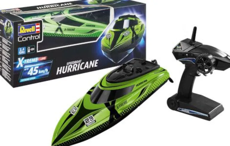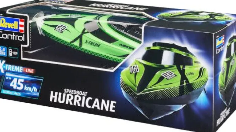 Die X-TREME Line von Revell Control steht für das ultimative Fahrerlebnis im RC Bereich. Das X-TREME Boat Hurricane bietet die Performance, die man sich wünscht. Mit dem robusten Rumpf, dem kraftvollen 7,4 V LiPo-Akku und der 2,4 GHz-Fernsteuerung treibst du den wassergekühlten Motor zu Höchstleistungen. Mit bis zu 45 km/h rast das X-TREME Boat Hurricane über das Wasser. Das Battery Warning System teilt dir mit wenn der Akku fast leer gefahren ist, so hast du immer noch genug Akkuleistung um in den Hafen zurück zu fahren. 4 x 1,5V AA Batterien benötigt / nicht enthalten Höchgeschwindigkeitsboot bis zu 45 km/h. Proportionale Lenkung und Gashebel. Mit Wasserkühlung für den Motor. 2,4 GHz Pistolen-Transmitter mit Batteriewarnung. Fahrzeit bis zu 12 Minuten. Mit LiPo-Akku und USB Ladegerät Lieferumfang: 1 x Modell 1 x 2CH-GHz-Transmitter 1 x USB-Ladegerät 1 x Akku 1 x Anleitung