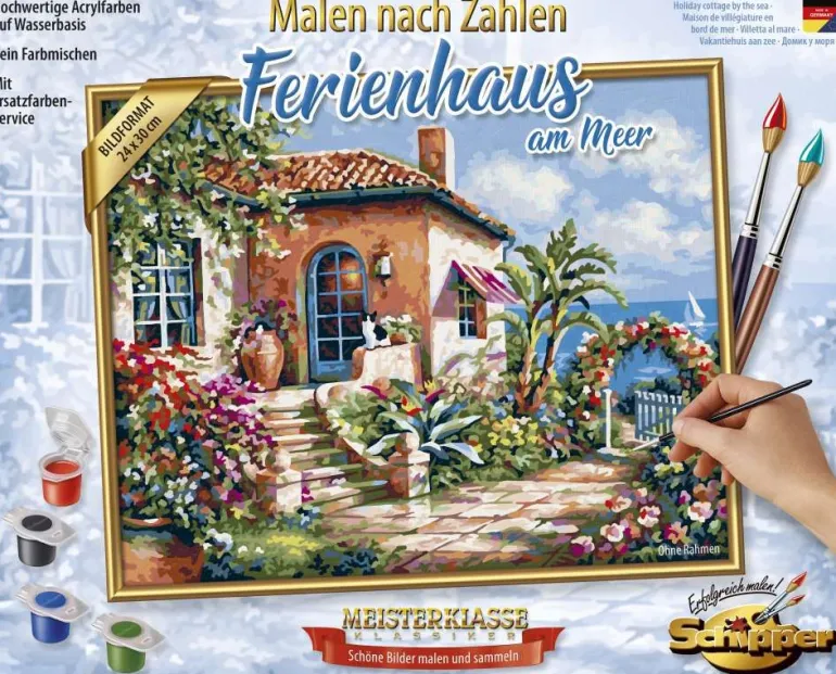Ferienhaus am Meer Malerisch und in üppiger Blumenpracht liegt das kleine Ferienhaus an der Küste. Das Bild lädt den Betrachter ein, den herrlichen Blick über das Meer schweifen zu lassen. Schon beim Malen kommen hier Urlaubsgefühle auf. Denn der Hobbymaler erschafft hier einen Ort, an dem Sonne, Meer und mediterranes Flair spürbar werden.