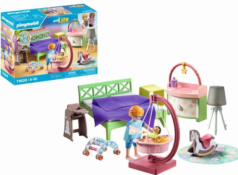 Modernes PLAYMOBIL-Schlafzimmer mit Babyspielecke für vergnügliche Rollenspiele im trauten Heim. Spielset aus nachhaltigem Material mit zwei PLAYMOBIL-Figuren, Bett, Wickeltisch und vielen liebevollen Extras.
