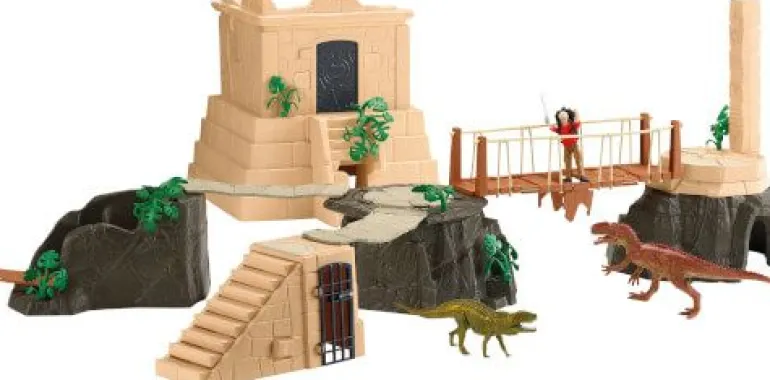 Flynn will unbedingt in den Tempel! Da drin ist ein wertvoller Schatz verborgen. Aber oh Schreck – der Tempel wird von zwei Dinos bewacht – dem Monolophosaurus und dem Postosuchus! Die beiden Fleischfresser verfolgen ihn auf Schritt und Tritt. Jetzt muss er nicht nur den richtigen Weg finden, sondern auch noch vor den Dinos fliehen. Die Tempelanlage ist ein reiner Hindernislauf. Jedes Mal sieht sie anders aus, weil sie immer neu zusammengesetzt werden kann. Überall lauern Gefahren. Vorsichtig balanciert Flynn über die morsche Hängebrücke. Geschafft. Vor ihm liegt der Tempel. Er steigt die Treppe hoch, als sich die Stufen plötzlich in eine Rutsche verwandeln. Hilfe! Wie kommt er aus dem Raum hier wieder raus? Wenn er die richtige Schalterkombination findet, dreht sich die Wand und gibt den Weg frei. Schwierig! Und dann muss er ja noch alle Schlüsselteile für die Tempeltür in den Geheimverstecken finden. Jetzt ist er auch noch in eine Gitterfalle getappt. Wer hilft ihm?