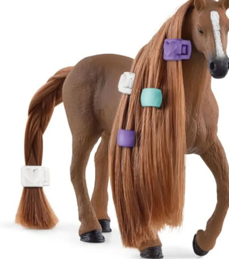Zur neuen Schleich® Horse Club Sofia’s Beauties Spielewelt gehört auch die Beauty Horse Englisch Vollblut Stute. Als stolzes Springpferd genießt es die Stute, sich striegeln und frisieren zu lassen. Kannst du ihr mit der Haarklammer am Schweif helfen?