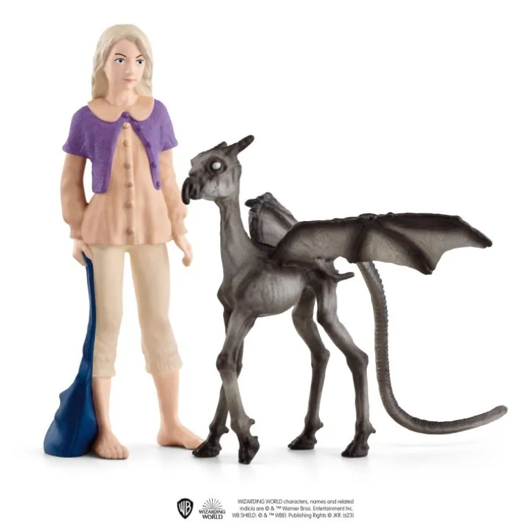 Luna™ Lovegood ist hier barfuß mit ihren langen blonden Haaren, ihrer lila Weste und ihrer blauen Tasche. Neben ihr steht das kleine Thestral mit seinen ausgebreiteten Flügeln.