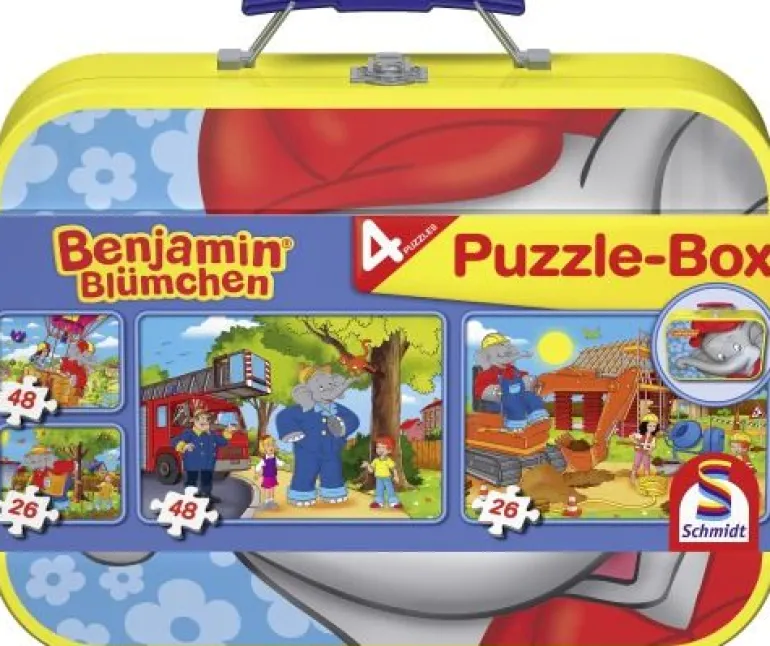 Die Metallbox beinhaltet 4 Benjamin Blümchen-Puzzles mit je 2 x 26 Teilen und 2 x 48 Teilen.