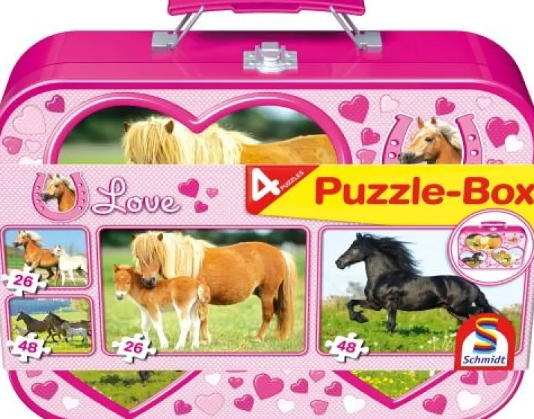 Vier tolle Puzzle mit Pferdemotiven in dekorativem Metallkoffer, mit unterschiedlicher Teileanzahl! Ab 4 Jahren.