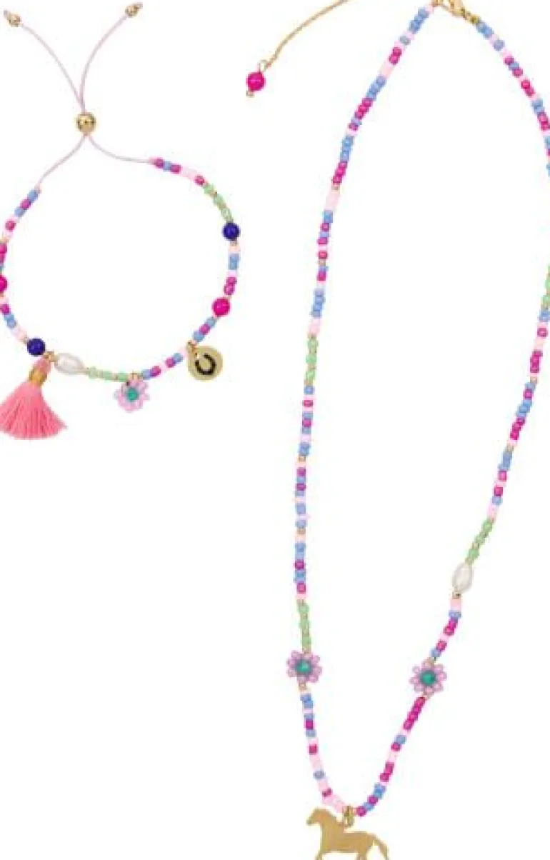 Dieses zauberhafte Schmuckset, bestehend aus einem Armband und einer Kette, ist das ideale Geschenk für kleine und große Pferdefreunde. Die Kette hat einen Durchmesser von ca. 15 cm, während das Armband einen Durchmesser von ca. 6 cm hat. Ideal für den Hals und das Handgelenk Ihres Kindes. Mit seinen trendigen Details ist dieses Schmuckset ein absolutes Must-Have für alle modischen Pferdefreunde. Die Perlen aus Glas und der pferdestarke Anhänger aus Metall sind ein echtes Highlight und runden jedes Outfit ab. Ob für die eigene Schmuck-Schatulle oder als Geschenk für die beste Freundin, dieses liebevoll gestaltete Set von Die Spiegelburg lässt die Herzen echter Pferdefreunde höher schlagen.