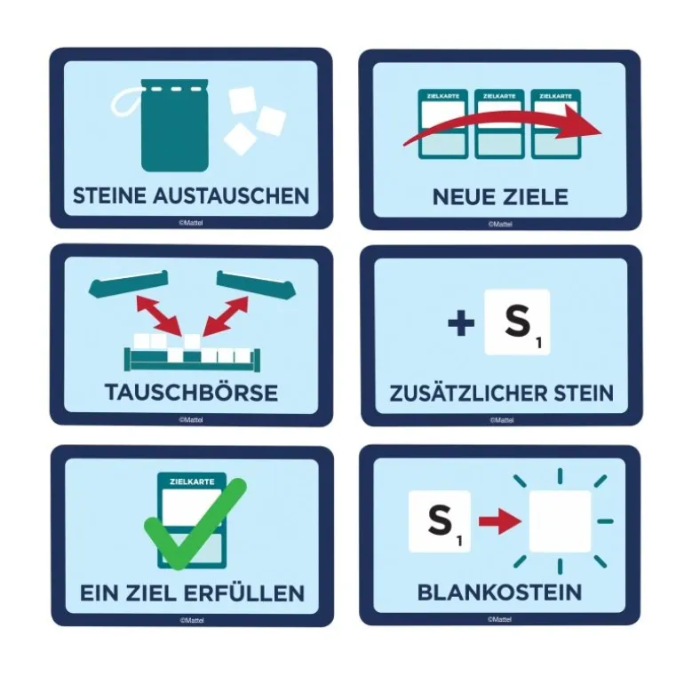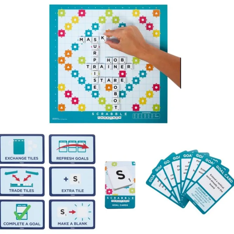 • Bei Scrabble Team wird als Gruppe zusammengearbeitet und es können bis zu 50 verschiedene Zielkarten erfüllt werden, die dabei helfen, die Grundlagen von Scrabble zu vermitteln.