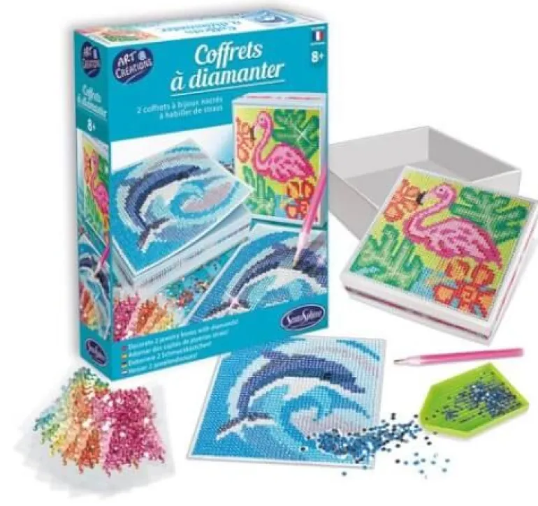 Inhalt: Motivvorlagen , Strasssteine in 15 verschiedenen Farben, Stift zum Anbringen der Strasssteine, Klebeplatte aus Wachs, 2 Schatullen und Anleitung.