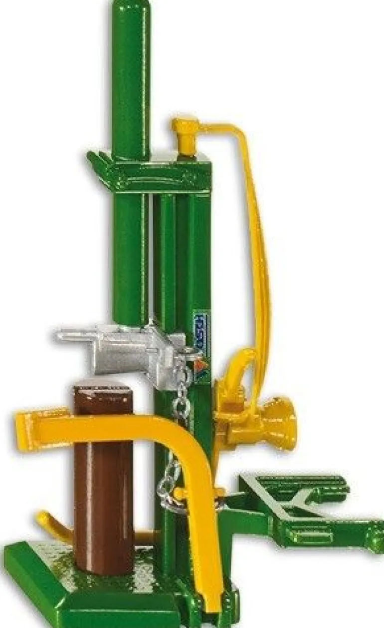 Zum fachgerechten Spalten von Brennholz ist ein Holzspalter unerlässlich. Angehängt an die Heck-Kupplung eines SIKU-Traktors spaltet das Gerät der österreichischen Firma Posch vorbildgerecht die mitgelieferten Kunststoffbaumstämme in zwei Teile.