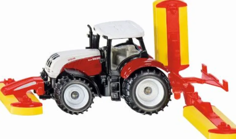 Eine neuartige Kombination bereichert das SIKU-Sortiment im kleinen Maßstab. Die Grünland-Erntekette ist nun mit dem Steyr Traktor und der Pöttinger Mähwerkskombination komplett. Die Mähwerke sind abnehmbar, sodass der Traktor auch zu anderen Aufgaben zur Verfügung steht. Das Heckmähwerk ist für den Strassentransport klappbar. Ab 3 Jahren.