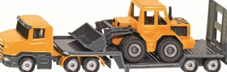SIKU Tieflader mit Frontlader. Spielzeugmodelle aus Metall, die im Zinkdruckverfahren hergestellt werden. Die Ansteckteile/Accessoires sind aus Kunststoff. Im originalgetreuen Design.
