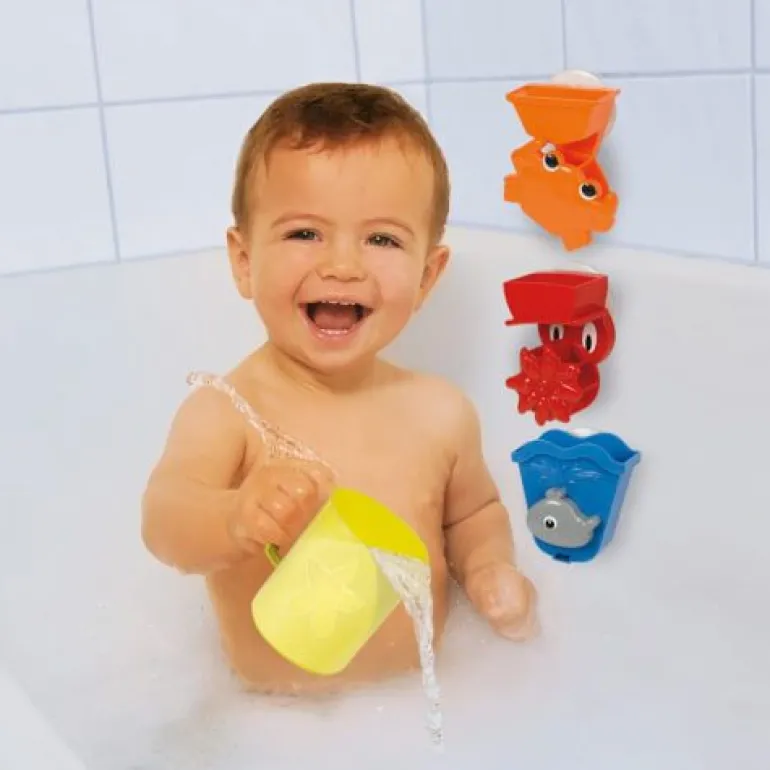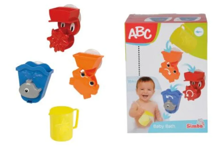 ABC Badespielset: Mit dem ABC Badespielset wird es in der Badewanne nicht mehr langweilig. Die drei Tierchen können mit dem Saugnapf übereinader oder nebeneinander an der Badewanne befestigt werden. Mit dem Becher wird Wasser in die Wasserräder und Trichter geschüttet und der Badespaß beginnt. Für Kinder ab 18 Monaten geeignet.
