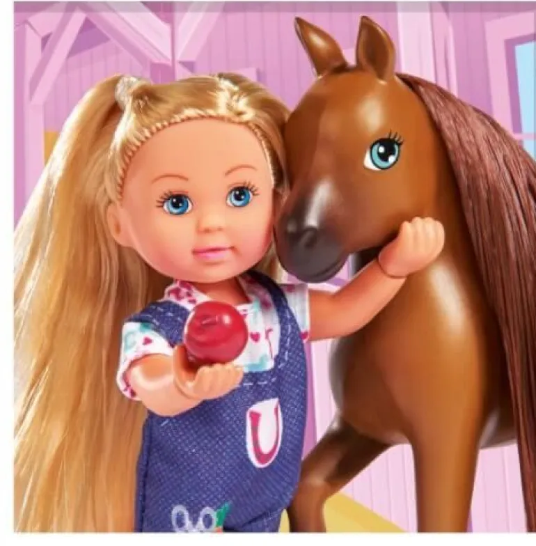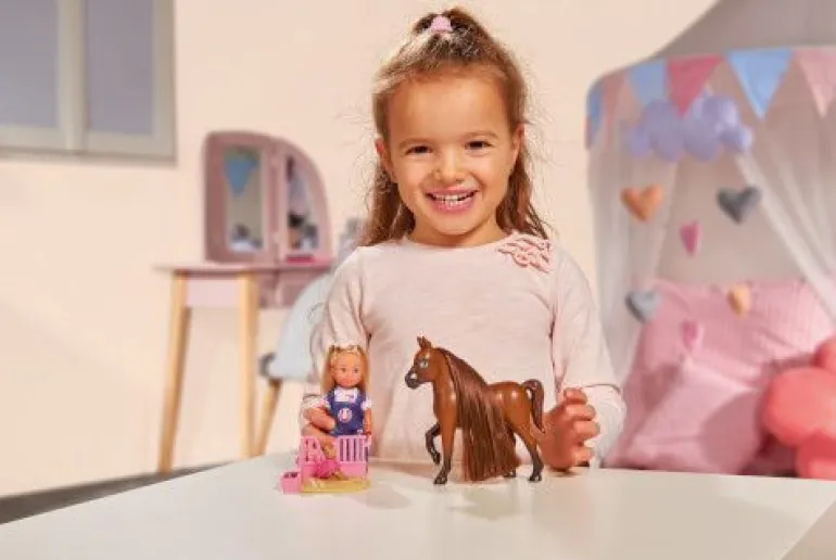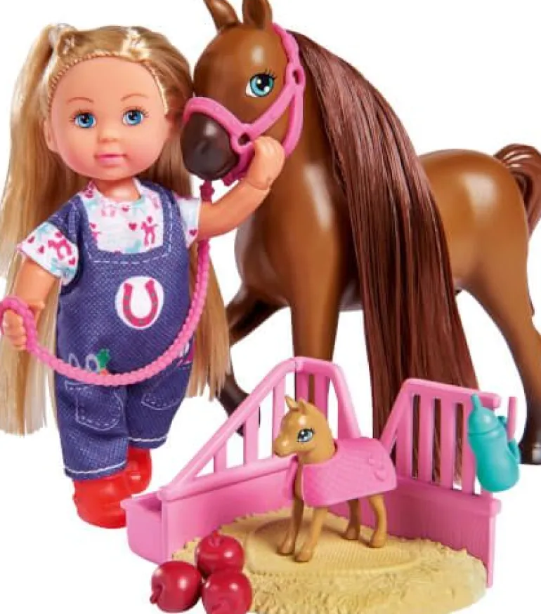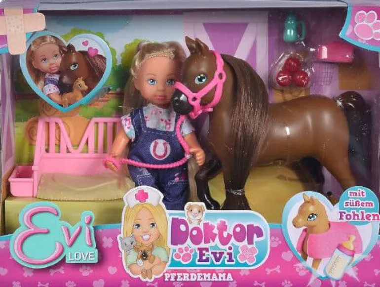 Die kleine Doktor Evi hilft Tieren in Not! Bei einem Pferdeeinsatz wartet ein trächtiges Pferd darauf von Doktor Evi bei der Geburt des kleinen Fohlens unterstützt zu werden. Mit ihrer Hilfe kann die Pferdemama ein gesundes braunes Fohlen zur Welt bringen. Evi liebt es den Tieren zu helfen. Das süße Fohlen kann sich anschließend auf dem Schlafplatz etwas hinlegen und ausruhen. Das Evi LOVE Set “Doktor Evi Pferdemama“ von Simba Toys ist für Kinder ab 3 Jahren geeignet.