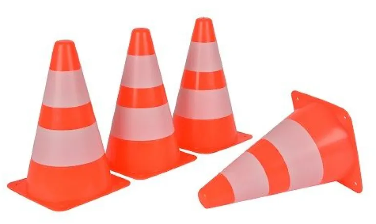 4er Set Pylonen: Helfer bei Straßenabsperrungen gesucht. Mit Hilfe der 4 Hütchen lassen sich Straßen absperren oder zu einem Parcours aufbauen um den du Slalom fahren kannst. Ein Pylon ist universell einsetzbar, wo Achtung, Vorsicht und Signalbedarf geboten ist. Der grellfarbig gestreifte Verkehrs-Begrenzungshut markiert Flächen, mahnt bei Annäherung zu Fuß oder per Fahrzeug zu erhöhter Achtsamkeit. Ideal für das persönliche Verkehrssicherheitstraining mit ihren Kindern oder einsetzbar auf der Spielwiese zur Erstellung eines Fahrradparcours oder einer Hindernislauf-Strecke. Auf weichem Untergrund können die Spielzeugbegrenzungshütchen mit Heringen im Boden befestigt werden.