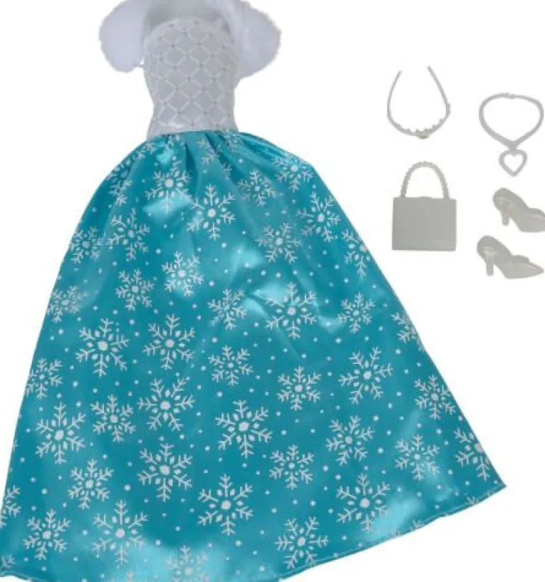 Kleide deine Steffi in einem atmenberaubenden Prinzessinnenkleid. Der obere Teil des Kleides ist in Weiß gehalten, ab der Taille verläuft der Rock in türkisener Farbe fließend nach unten. Darauf sind viele kleine Schneeflocken abgebildet. Passende Accessoires wie Diadem, Halskette, Schuhe und Tasche komplettieren das Outfit von Steffi. Puppe nicht enthalten!