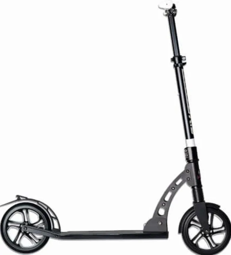 Hochwertiger Scooter mit Frontfederung, easy fold Klappmechanismus und Ständer Gegossene PU-Rollen 205 mm mit 2-farbiger Felge, High Rebound, 82A, Kugellager ABEC 7 Extrudierte Hinterradreibungsbremse, Schutzblech vorne Extra breiter BMX-Style Lenker mit ergonomischen TPR-Griffen inkl. Anti-Vibrations-Klemme Lenkstange mit verstärkter Lenkerschelle, 5-fach höhenverstellbar 83-107 cm, inkl. Schnellspanner und Sicherheitsarretierung Extra tiefes XL-Deck 58 x 15 cm mit umlaufender Randverstärkung Sicherheitsreflektoren vorne und hinten. Max. Benutzergewicht 100 kg