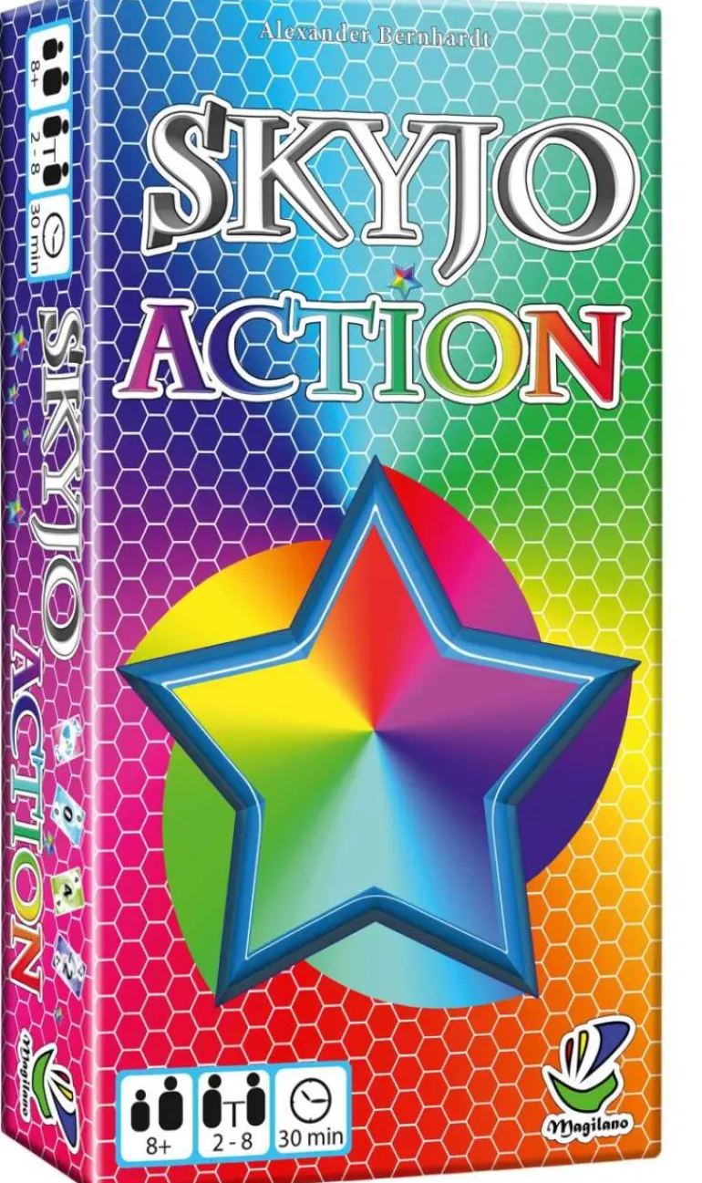 SKYJO ACTION von MAGILANO ist das neue aufregende Kartenspiel für eingespielte SKYJO Fans und solche, die es noch werden wollen. Das Spielziel ist wie beim klassischen SKYJO das Erreichen eines möglichst geringen Punktestandes. Neben Zahlenkarten sind bei SKYJO ACTION zusätzlich Aktionskarten und Sternkarten mit von der Partie, die den Spielern viele neue Handlungsmöglichkeiten geben, um dieses Ziel zu erreichen.