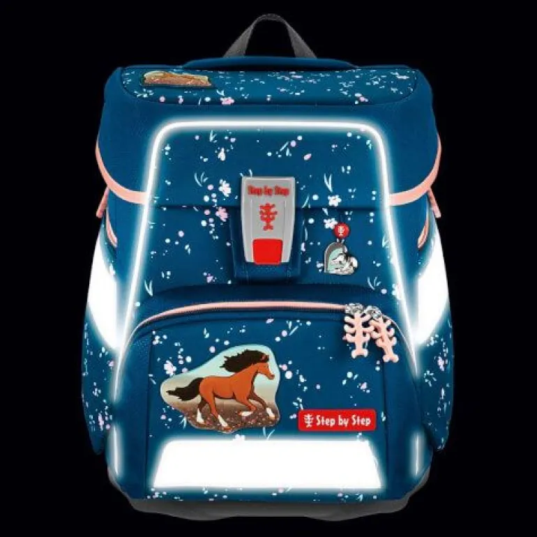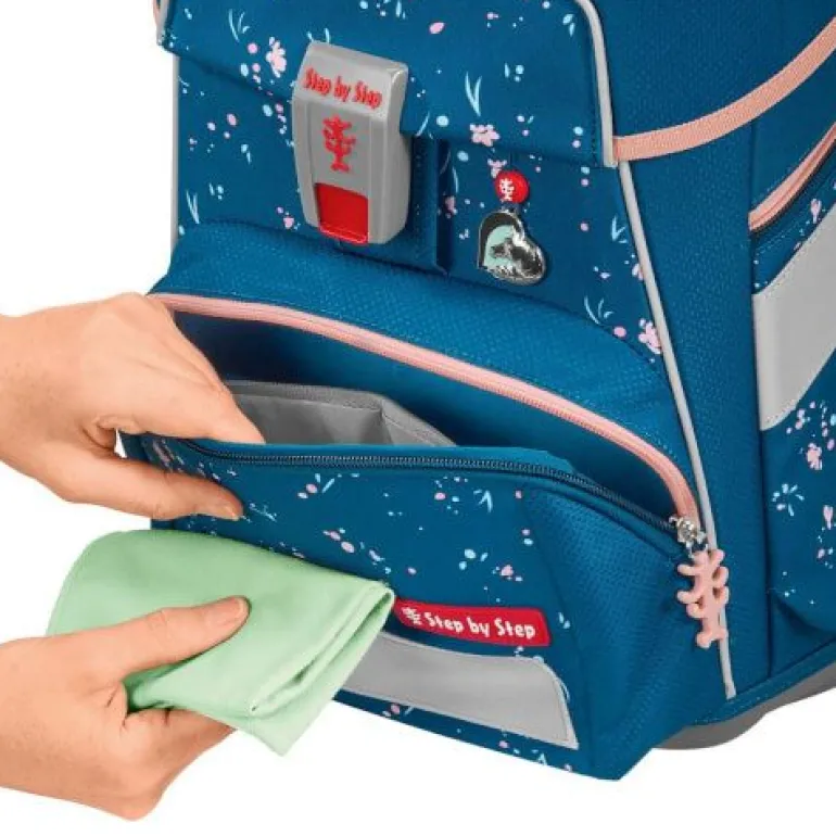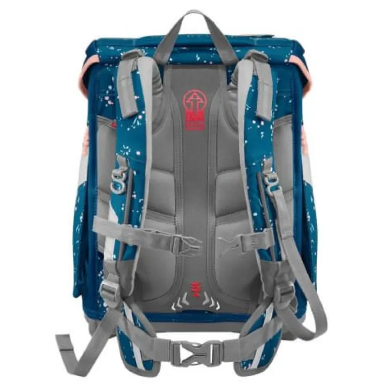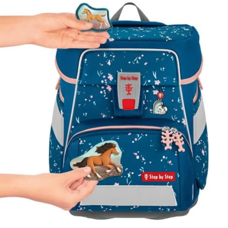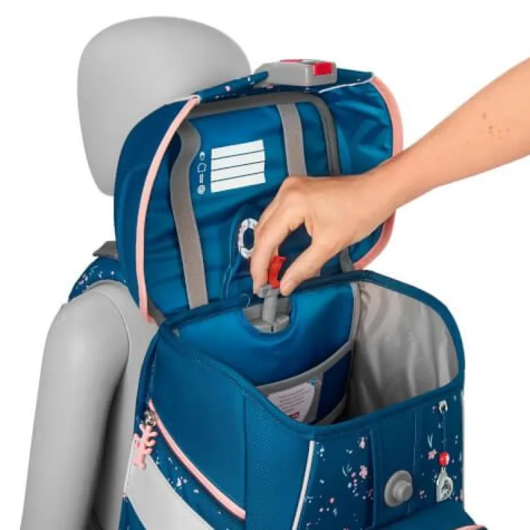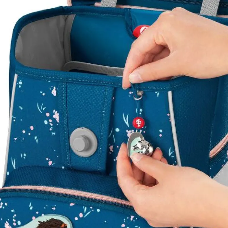 – zur Beförderung von Schulutensilien vom Stift bis zum Sportzeug 5- teiliges Schulranzen-Set bestehend aus: – Schulranzen – Federmäppchen, komplett bestückt – Schlamperetui – Turnbeutel – MAGIC MAGS (2 Applikationen und 1 Anhänger) Schulranzen: – der geräumige Schulranzen – wechselbare Motive, MAGIC MAGS – EASY GROW SYSTEM: Schulranzen wächst von der 1. bis zur 4. Klasse mit – ultraleichte, elastische Fiberglas-Rückenkonstruktion und ergonomisch geschwungene, atmungsaktive Rückenpartie – verstellbare und ergonomische Schultergurte – Lageverstellriemen zur körpernahen Schulranzen-Positionierung – abnehmbarer, höhenverstellbarer Brustgurt – Gurtenden-Einhängung – gepolsterte, abnehmbare Hüftflosse – seitlich nach außen wachsende Reißverschluss- und Fronttasche mit Auslaufösen – Aufhängeschlaufe und gepolsterter Tragegriff – Fidlock-Magnetverschluss – Hauptfach mit Bücherfach – Laschen zur Aufbewahrung des Federmäppchens im Deckel – wasserdichte Bodenplatte – reflektierende Elemente sorgen für Sicherheit im Straßenverkehr und bei Dunkelheit – strapazierfähiges und wasserabweisendes Material mit 100% PFC-freier Beschichtung – die Textilien bestehen zu 100% aus recycelten PET-Flaschen – sozial verträglich und verantwortungsvoll produziert Verbraucherhinweis: Die Bestandteile des MAGIC MAGS-Zubehörs lassen sich beliebig oft von den entsprechenden Flächen des Schulranzens abnehmen und durch andere MAGIC MAGS ersetzen. Diese sind in 3er-Sets separat erhältlich. Für eine neutrale Gestaltung des Ranzens können die MAGIC MAGS einfach komplett weglassen werden, ohne dass störende Klettflächen entstehen. So wird jeder Schulranzen zum Unikat. Das Gewicht des Schulranzen-Korpus ohne abnehmbare Elemente beträgt ca. 1250 g. Das Gesamtgewicht des Schulranzens mit allen abnehmbaren Elementen beträgt ca. 2050 g.