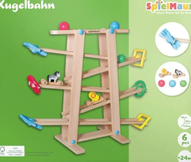 SpielMaus Holz Kugelbahn mit 5 Ebenen. Inklusive 3 Kugeln und 2 Autos mit Tierfigur. Maße ca. 66×11,5×56 cm. Für Kinder ab 24 Monaten.