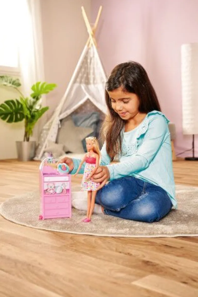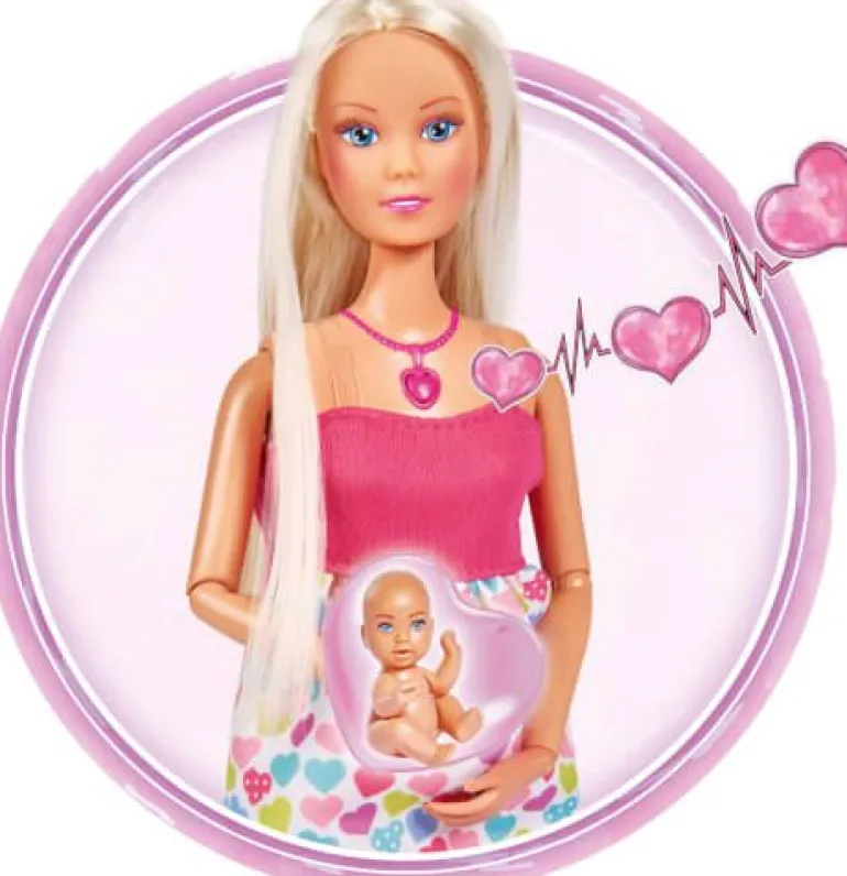 Schwangere Steffi mit Baby und tollen Sounds, Babyzubehör und Babyschale. Try-me Verpackung. Ca. 29 cm. Ab 3 Jahren