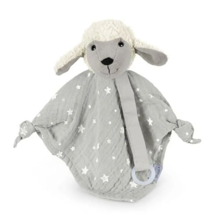 Kleines Schmusetuch Schaf Stanley aus Flauschstoff, Polycotton und Musselin mit Schnullerband – passend für alle Schnuller, ob mit oder ohne Ring.