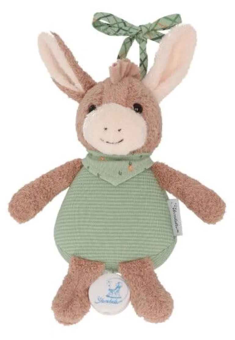 Der süße kleine Esel Emmilius aus Flauschstoff und Jersey mit Spieluhr singt das Baby in den Schlaf. Bindebänder sorgen für eine einfache Befestigung an Bettchen, Kinderwagen oder im Auto. Melodie: The Sound of Silence