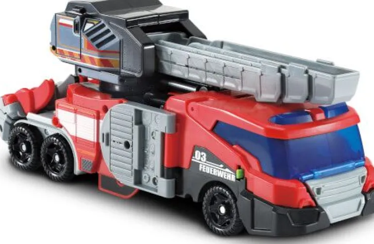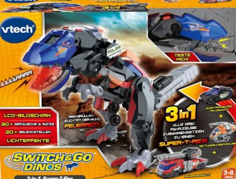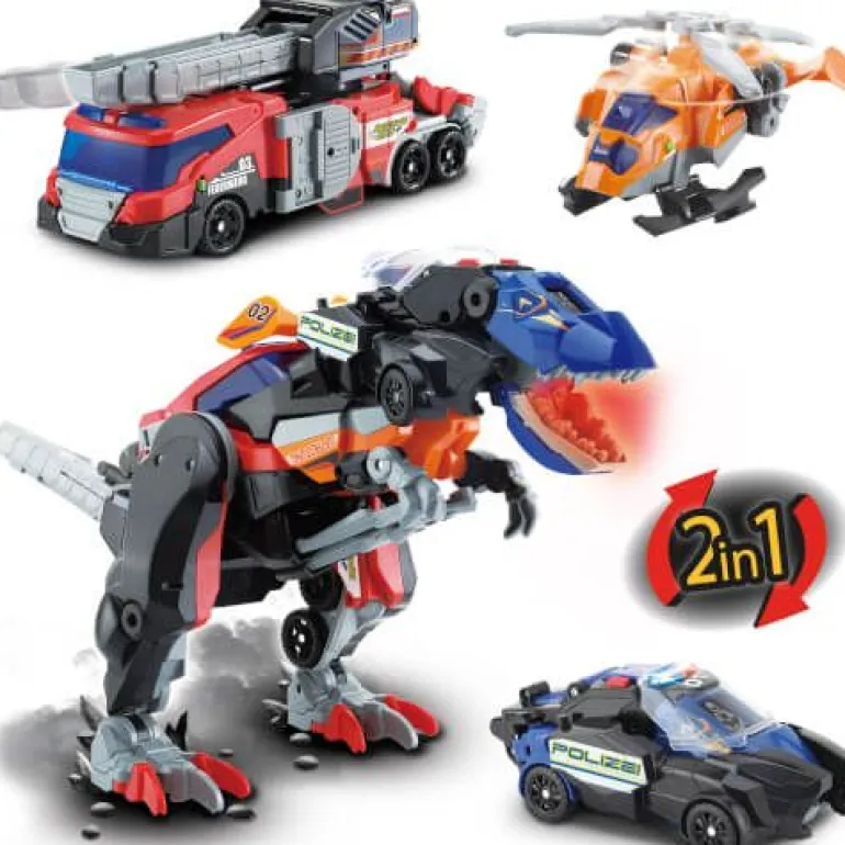 Mit dem 3-in-1 Super-T-Rex jedes Abenteuer heldenhaft meistern! Dieser coole T-Rex besteht aus drei Einheiten, die sich mit wenigen einfachen Handgriffen in drei Rettungsfahrzeuge umwandeln lassen – Polizeiauto mit LCD-Bildschirm und LED-Blaulicht – Feuerwehrauto mit ausfahrbarer Feuerleiter – Helikopter mit drehbarem Propeller. Zwei Spielmodi: Dinomodus und Fahrzeugmodus. Mit einfachen Handgriffen können die Fahrzeuge wieder zu einem Dino zusammengesetzt werden.