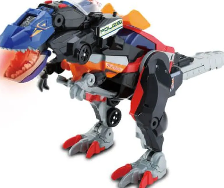 Im Dino- und im Polizeiauto-Modus werden mehr als 30 gesprochene Sätze sowie passende Geräusche abgespielt. 17 Gelenkstellen erlauben es, die Haltung des T-Rex zu verändern. Mit Lautstärkeregler. Kindersicheres Batteriefach und Abschaltautomatik. Demobatterien sind enthalten.