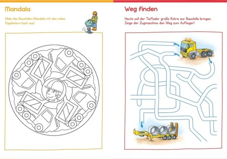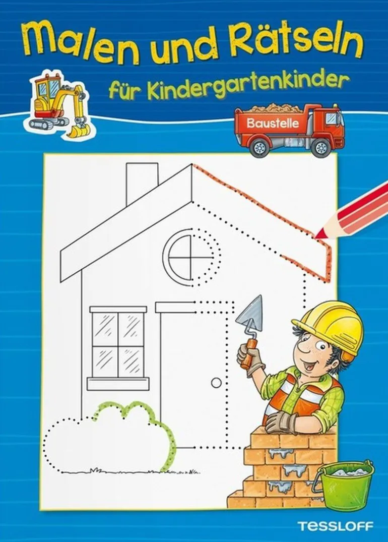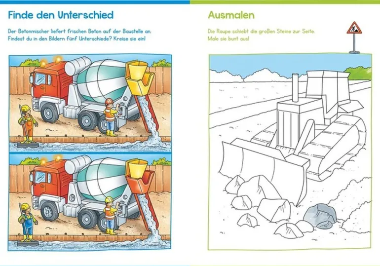 Achtung, aufgepasst! Auf der Baustelle gibt es jede Menge zu erledigen: Das Baustellen-Sudoku muss gelöst, der Mini-Bagger von Punkt zu Punkt verbunden und die Akkuschrauber, Latthammer und Malerrollen gezählt werden. Hier ist das Knowhow von Baustellenfans im Kindergartenalter gefragt. Natürlich hält das Heft auch Motive von Walze, Kipplaster und Bagger zum Ausmalen bereit. Welcher Schatten gehört zu welchem Bagger? Welche fünf Unterschiede gibt es bei den beiden Betonmischfahrzeugen? Und wie ist die richtige Abfolge beim Hausbau? Das Lösen der liebevoll gestalteten Aufgaben zum Suchen und Zählen, Zuordnen und Verbinden, Nachspuren und Ausmalen macht Riesenspaß und fördert ganz nebenbei auch Konzentrationsvermögen und Motorik.