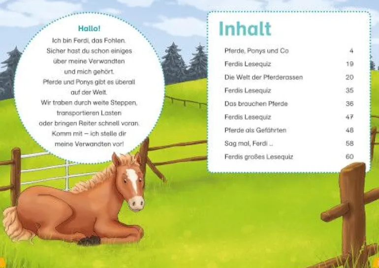 Fohlen galoppieren ausgelassen über die Weide. Im Reitstall werden die Pferde versorgt und für den Ausritt vorbereitet. Die gutmütigen Ponys sind besonders bei Reitanfängern beliebt… Die Reihe WAS IST WAS Erstes Lesen bietet durch die große Fibelschrift und die kurzen Textabschnitten eine ideale Hinführung zum selbständigen Lesen. Leseanfänger haben so die Möglichkeit, sich ihr Lieblingssachthema selbst Stück für Stück zu erschließen. Für Spaß und Unterhaltung sorgen in diesem Band Ferdi, das Fohlen, das die Kinder durch das Buch begleitet und verschiedene Lesequiz.