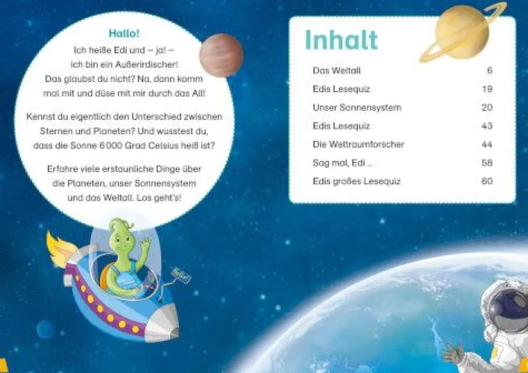 Die unenedliche Größe des Universums lässt sich beim Blick zu den Sternen nur erahnen – gerade das hat bereits auf Kinder eine faszinierende Wirkung. Welche Planeten gibt es in unserem Sonnensystem? Wie ist das Weltall aufgebaut? Und was muss ein Astronaut können? Durch das Buch führt Edi, der Außerirdische, in seinem Ufo. Die große Fibelschrift und das klare Layout sind speziell für Leseeinsteiger konzipiert, im Vordergrund stehen die Übersichtlichkeit und Lesbarkeit der Texte. Alles verstanden, Neues gelernt? Das Lesequiz gibt Antwort.
