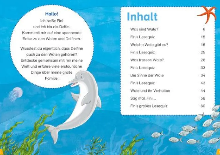 Ein riesiger Wal hebt seine mächtige Fluke aus dem Meer. Lustige Delfine springen flink über die schäumenden Wellen. Ein Pottwal macht sich in der Tiefe auf die Suche nach seiner Lieblingsspeise. An der Seite von Fini, dem kleinen Delfin, begeben sich Erstleser in die spannende Welt des Wissens. Die große Fibelschrift und das klare Layout sind speziell für Leseeinsteiger konzipiert, im Vordergrund stehen die Übersichtlichkeit und Lesbarkeit der Texte. Alles verstanden, Neues gelernt? Das Lesequiz gibt Antwort.