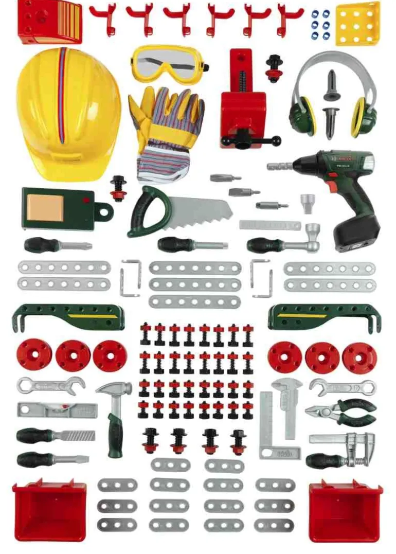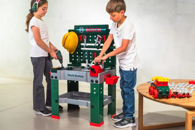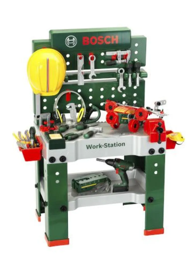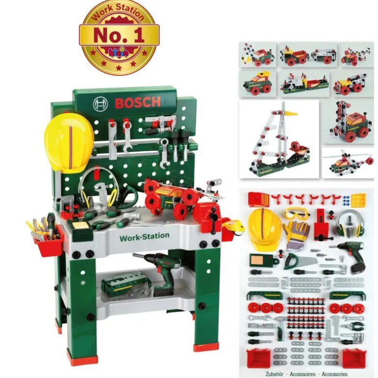 Bosch Werkbank No. 1 – 150 – teilige Werkbank im Bosch Design – Arbeitsplatte mit Lernfunktion Mit Bosch Akkuschrauber II – Batteriebetriebener Akkuschrauber mit rotierendem, auswechselbarem Bohrer/Schrauber – Rechts-/Linkslauf und mit realistischem Bohr-/Schraubgeräusch und Licht – Mit auswechselbaren Aufsätzen Mit zahlreichen Spielmöglichkeiten und Zubehör: – Konstruktionsset – Helm, Ohrenschützer, Arbeitsbrille und Arbeitshandschuhe – Soundmodul, Schraubstock, Ablagekästen, Aufhänghaken – Verschiedene Werkzeuge, Nägel, Schrauben und Muttern – Geeignet für Kinder ab 3 Jahren – Made in Germany