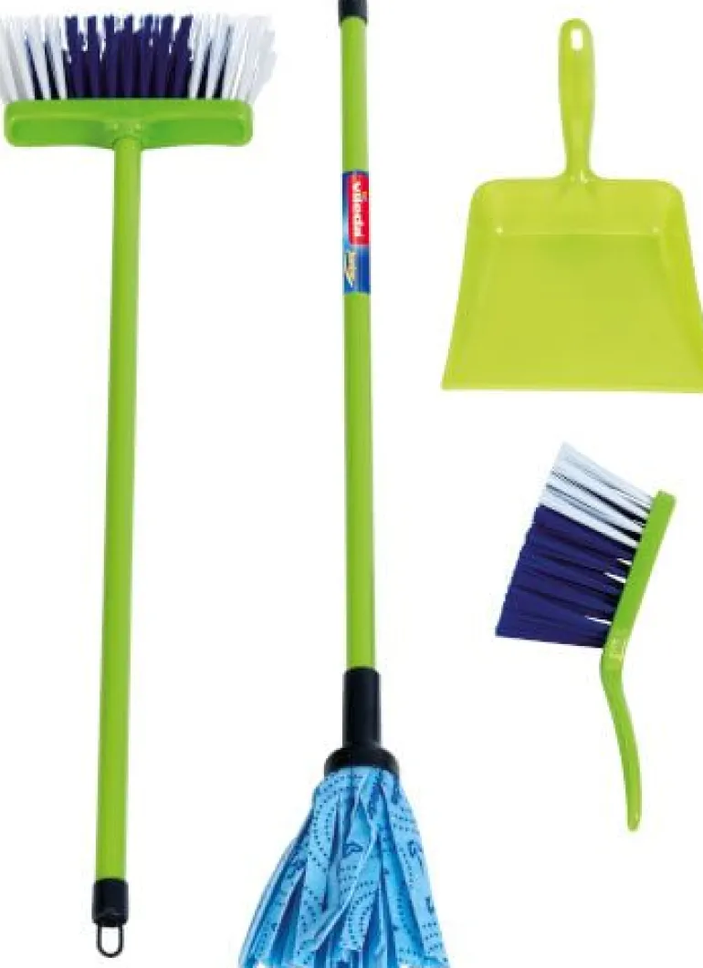 Vileda Wischmopp Set “Color Line“, 4-teilig – Länge des Wischmops: 62 cm – Länge des Besens: 55,5 cm Set bestehend aus: Wischmop, Besen, Handbesen und Handschaufel – Geeignet für Kinder ab 3 Jahren – Made in Germany