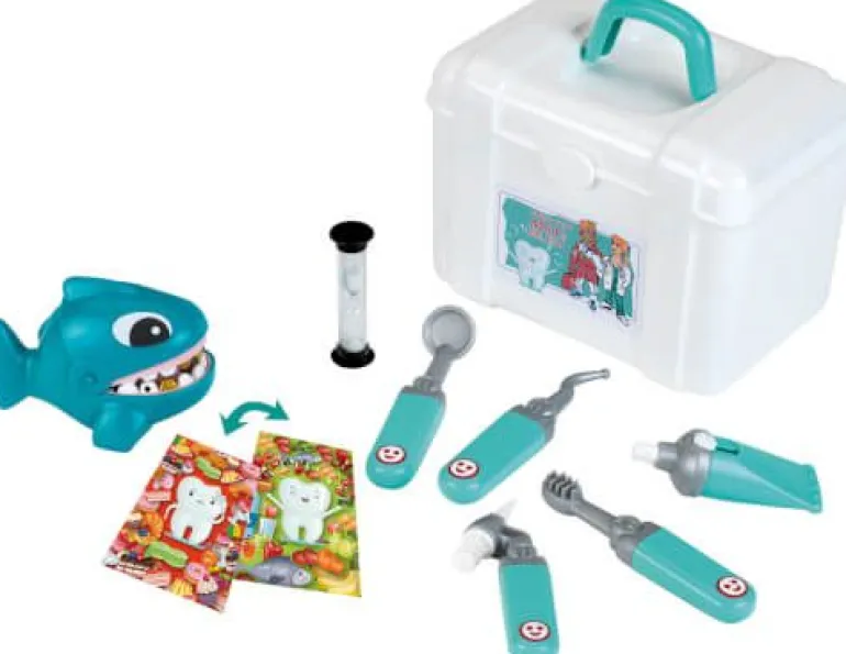 Zahnarztkoffer mit zahlreichem Zubehör, z.B.: – Zahnarztspielgel – Zahnarzthaken – Zahnbürste – Zahnbohrer – Zahnpastatube – Spritze – Sanduhr – Haifisch