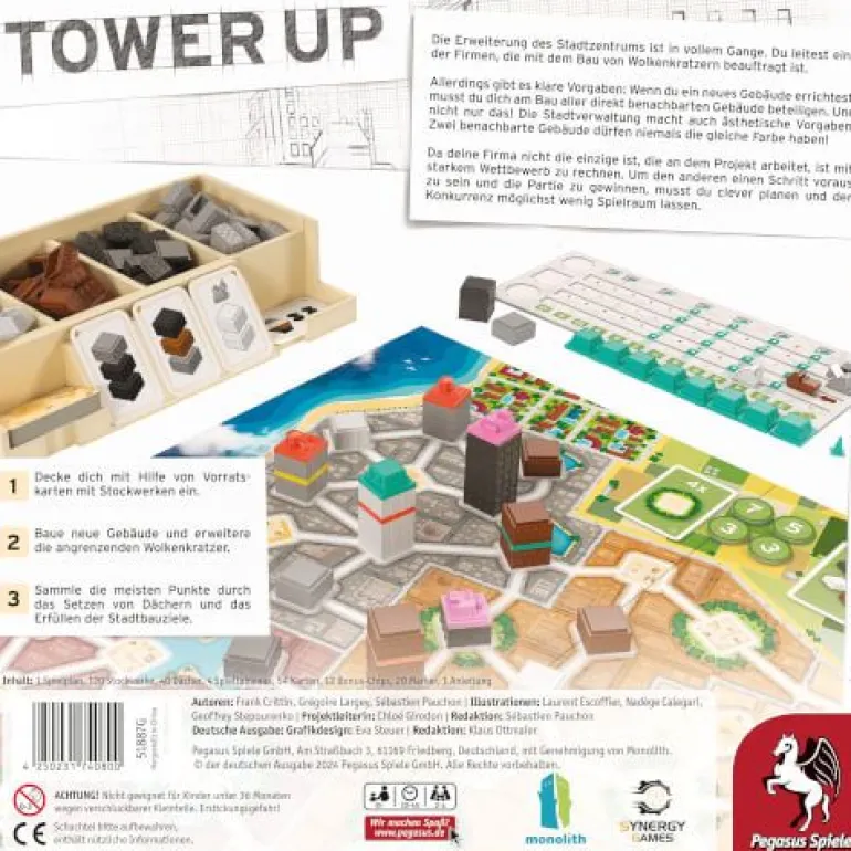 Die Erweiterung des Stadtzentrums ist in vollem Gange. Du leitest eine der Firmen, die mit dem Bau von Wolkenkratzern beauftragt ist. Allerdings gibt es klare Vorgaben: Wenn du ein neues Gebäude errichtest, musst du dich am Bau aller direkt benachbarten Gebäude beteiligen. Und nicht nur das! Die Stadtverwaltung macht auch ästhetische Vorgaben: Zwei benachbarte Gebäude dürfen niemals die gleiche Farbe haben! Da deine Firma nicht die einzige ist, die an dem Projekt arbeitet, ist mit starkem Wettbewerb zu rechnen. Um den anderen einen Schritt voraus zu sein un die Partie zu gewinnen, musst du clever planen und der Konkurrenz möglichst wenig Spielraum lassen.