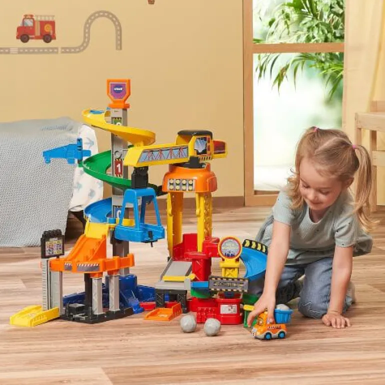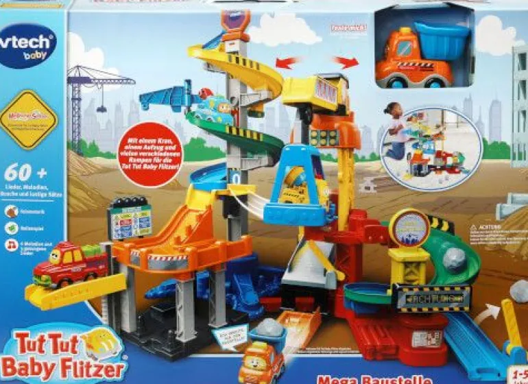 Auf der Tut Tut Baby Flitzer – Mega Baustelle Felsen transportieren, Schutt aufräumen und jede Menge Spaß haben! Enthält 1 Tut Tut Baby Flitzer – Kipplaster – 3 gesungene Lieder – 6 Kindermelodien. 6 magische Sensoren lösen Sätze, Melodien, Lieder und lustige Geräusche bei den Tut Tut Baby Flitzern mit magischer Erkennung aus. Auf der langen Spiralrampe können die Felsen bis ganz nach oben befördert werden.