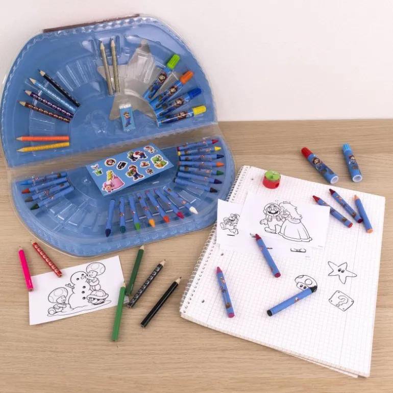Halbrunder Malkoffer mit Tragegriff, Inhalt: 12 Mini Buntstifte, 6 Fasermaler, 24 Wachsmalkreiden, Radierer, 2 Mini Bleistifte, Spitzer, 4 Poster, 1 Stickerblatt