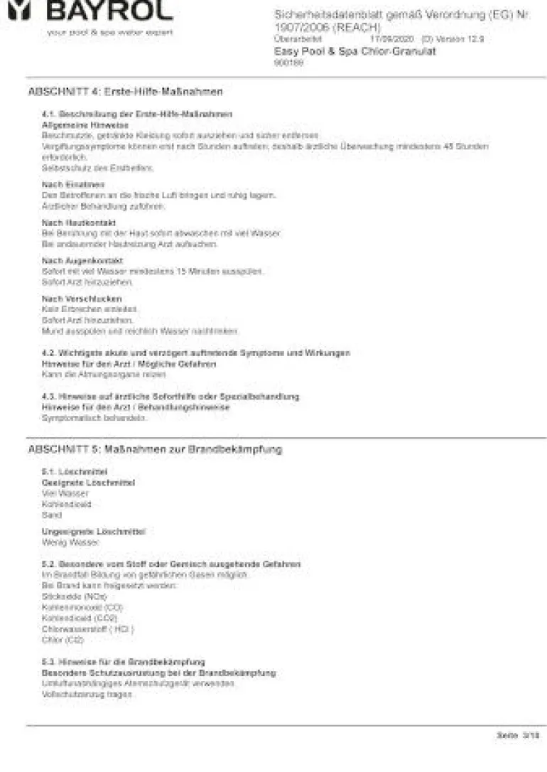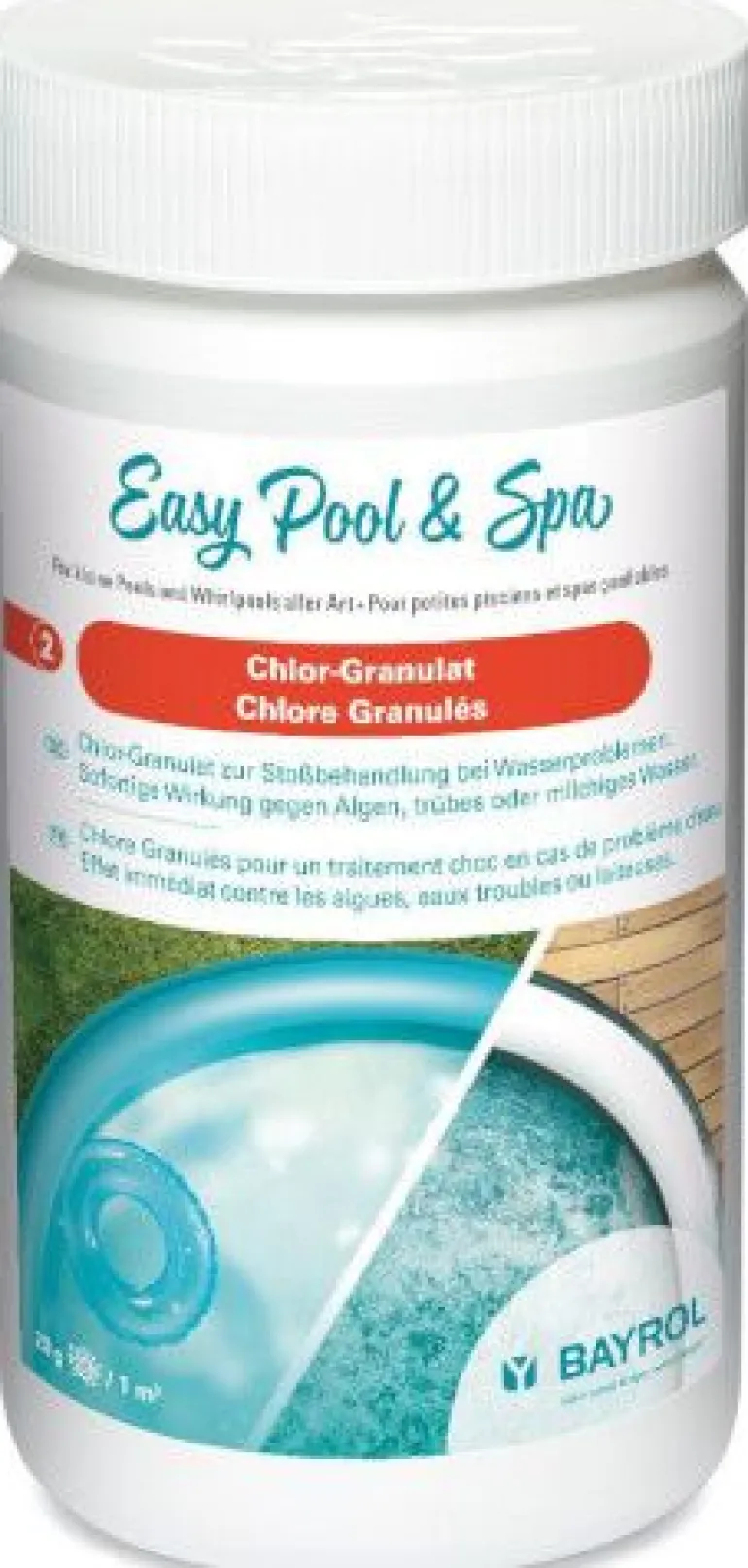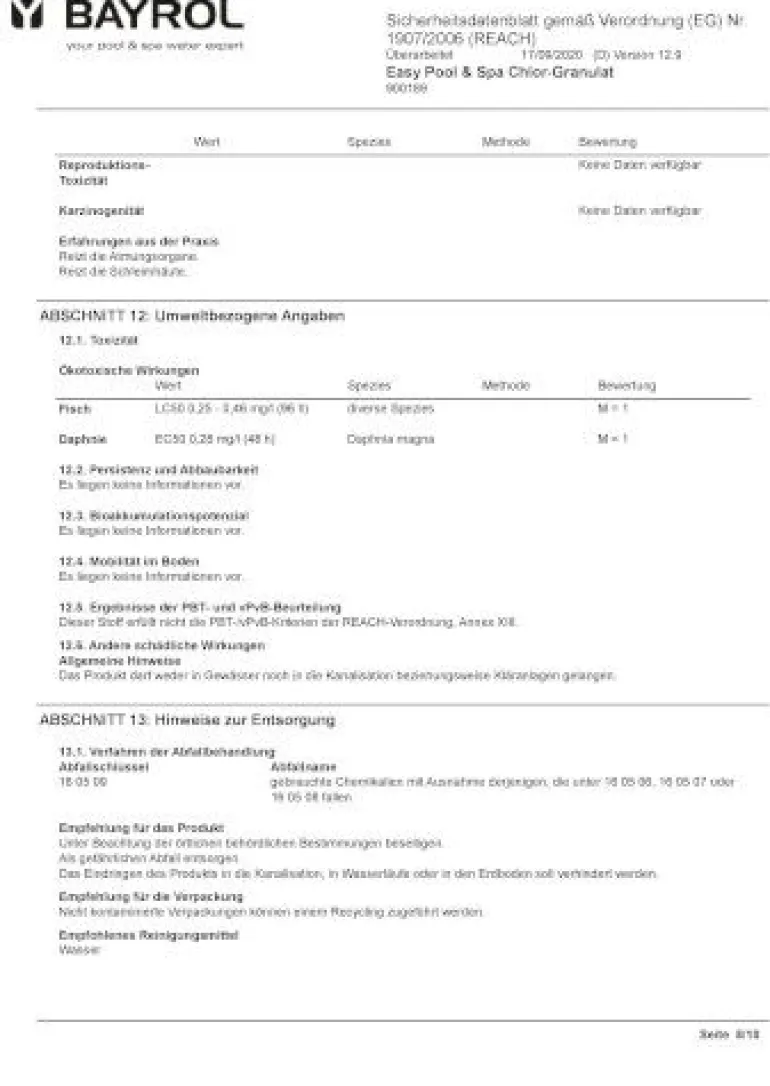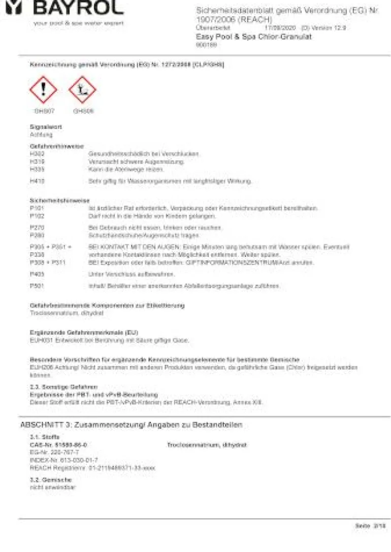 1 kg Chlor-Granulat zur Stoßbehandlung bei Wasserproblemen, wenn der pH-Wert über 7,4 liegt. Sofortige Wirkung gegen Algen, trübes oder milchiges Wasser in kleinen Pools und Whirlpools. Produktbeschreibung: Konzentriertes Säuregranulat Inhaltsstoffe Natriumbisulfat Kompatibel mit allen Desinfektionsmethoden und Filterarten Überprüfen Sie mindestens einmal wöchentlich den pH-Wert mit einem Wassertester und stellen ihn, falls erforderlich, auf den Idealbereich von 7,0 bis 7,4 ein. Dosierung gleichmäßig an mehreren Stellen bei laufender Umwälzpumpe direkt ins Wasser. Empfohlene Dosierung: 10 g pro 1 m# um den pH-Wert um 0,1 zu senken Biozidprodukte vorsichtig verwenden. Vor Gebrauch stets Etikett und Produktinformationen lesen. Gefahrenhinweis: H318 Verursacht schwere Augenschäden.