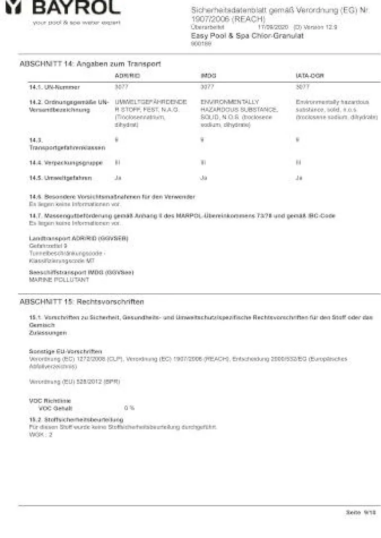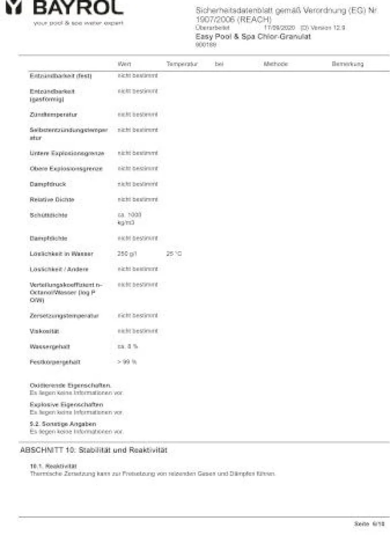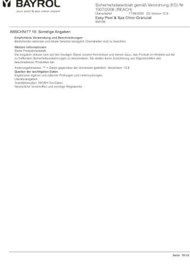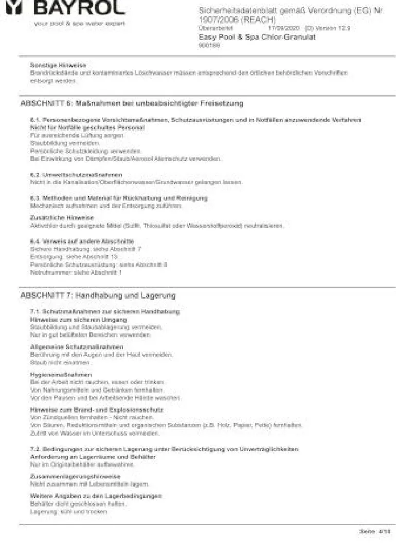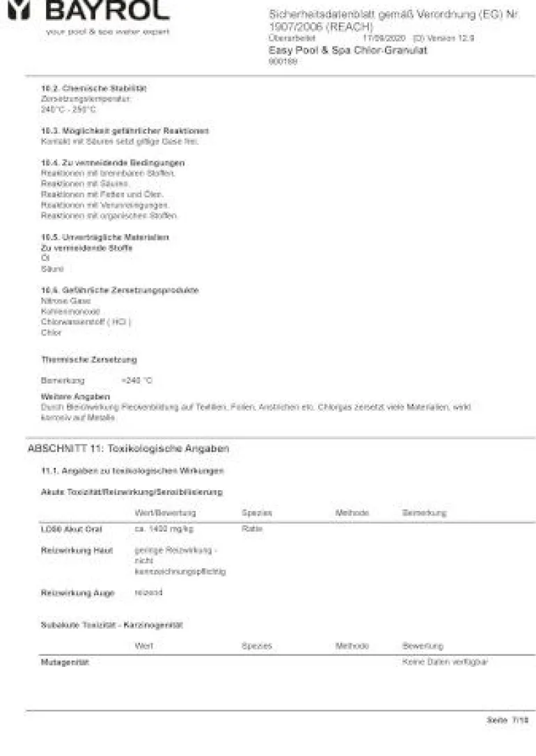 1 kg Chlor-Granulat zur Stoßbehandlung bei Wasserproblemen, wenn der pH-Wert über 7,4 liegt. Sofortige Wirkung gegen Algen, trübes oder milchiges Wasser in kleinen Pools und Whirlpools. Produktbeschreibung: Konzentriertes Säuregranulat Inhaltsstoffe Natriumbisulfat Kompatibel mit allen Desinfektionsmethoden und Filterarten Überprüfen Sie mindestens einmal wöchentlich den pH-Wert mit einem Wassertester und stellen ihn, falls erforderlich, auf den Idealbereich von 7,0 bis 7,4 ein. Dosierung gleichmäßig an mehreren Stellen bei laufender Umwälzpumpe direkt ins Wasser. Empfohlene Dosierung: 10 g pro 1 m# um den pH-Wert um 0,1 zu senken Biozidprodukte vorsichtig verwenden. Vor Gebrauch stets Etikett und Produktinformationen lesen. Gefahrenhinweis: H318 Verursacht schwere Augenschäden.