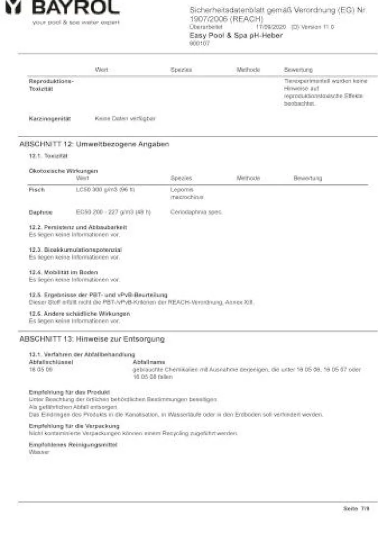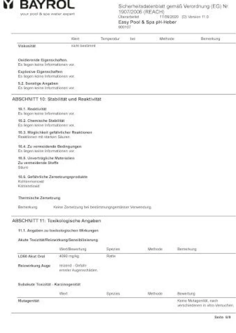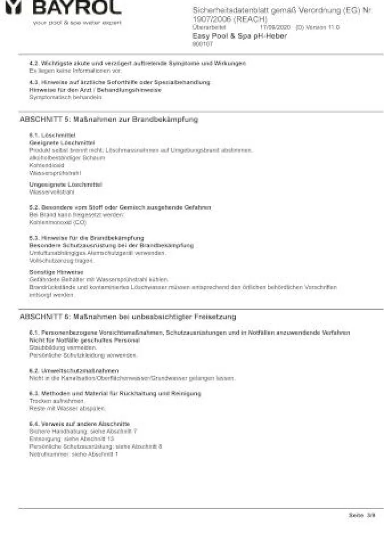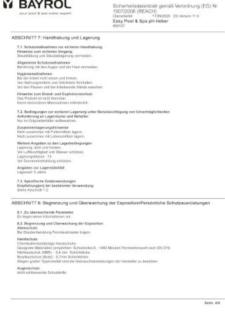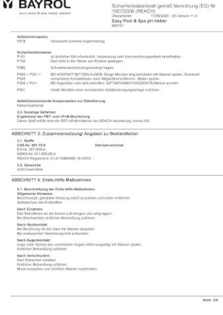 pH-Heber-Granulat ist ein konzentriertes alkalisches Pulver, es hebt den pH-Wert des Wassers und wird angewendet, wenn der pH-Wert unter 7,0 liegt. Mit Hilfe des beigefügten Messlöffels ist die Dosierung des Granulats sehr einfach. Inhaltsstoffe: Enthält Natriumcarbonat Kompatibel mit allen Desinfektionsmethoden und Filterarten Überprüfen Sie mindestens einmal wöchentlich den pH-Wert mit einem Wassertester und stellen ihn, falls erforderlich, auf den Idealbereich von 7,0 bis 7,4 ein. Dosierung gleichmäßig an mehreren Stellen bei laufender Umwälzpumpe direkt ins Wasser. Biozidprodukte vorsichtig verwenden. Vor Gebrauch stets Etikett und Produktinformationen lesen. Gefahrenhinweise: H319 Verursacht schwere Augenreizung.