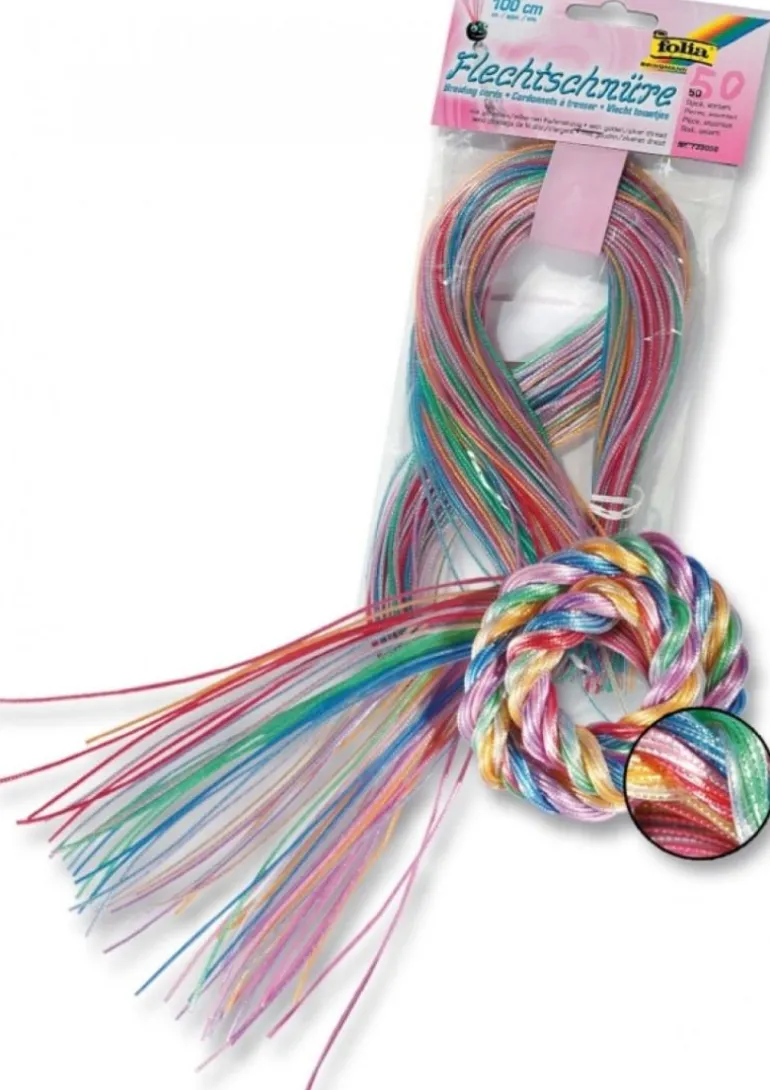 Flechtschnüre in 10 gängige Farben sortiert 50 Schnüre transparent mit goldenen / silbernen Fadeneinzug.