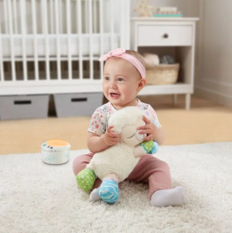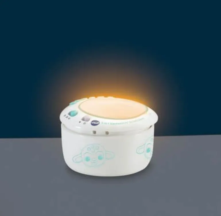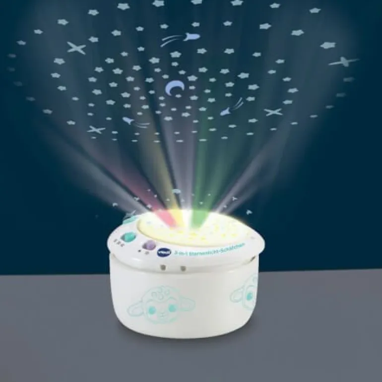 Niedliches Schäfchen aus Plüsch, das mit tollen Lichtprojektionen und Liedern beim Einschlafen hilft! 3 in 1: Schäfchen mit Lichtprojektion, entnehmbares elektronisches Modul, weiches Plüschtier. Das elektronische Modul projiziert einen beruhigenden Sternenhimmel an die Decke. Mit 3 austauschbaren Schablonen, die auf das elektronische Modul gesetzt werden können und verschiedene Leuchteffekte erzielen: Sternenhimmel, Wolken, Formen und Farben. Drei Modi: 25 Natur- und Alltagsgeräusche (z. B. Meeresrauschen, Grillenzirpen, Wasserfall, Wal- gesänge, Vogelzwitschern, Fön), 5 beruhigende Reime und Gedichte, 3 gesungene Lieder und 40 Melodien. Geräuschsensor lässt die Melodien erneut erklingen, sobald das Baby weint. Timer-Funktion für automatisches Abschalten nach 15, 30 oder 45 Minuten. Das elektronische Modul lässt sich herausnehmen, sodass das Schäfchen als Kuscheltier benutzt werden kann. Plüsch ist maschinenwaschbar. Lautstärke- und Lichtregler. Kindersicheres Batteriefach und Abschaltautomatik. Demobatterien sind enthalten